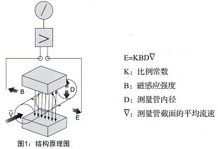 電磁流量計(jì)測量原理是基于法拉第電磁感應(yīng)定律。流量計(jì)的測量管是一內(nèi)襯絕緣材料的非導(dǎo)磁合金短管。兩只電極沿管徑方向穿通管壁固定在測量管上。其電極頭與襯里內(nèi)表面基本齊平。勵(lì)磁線圈由雙向方波脈沖勵(lì)磁時(shí),將在與測量管軸線垂直的方向上產(chǎn)生一磁通量密度為B的工作磁場。此時(shí),如果具有一定電導(dǎo)率的流體流經(jīng)測量管,將切割磁力線感應(yīng)出電動勢E。電動勢E正比于磁通量密度B、測量管內(nèi)徑d與平均流速V的乘積,電動勢E(流量信號)由電極檢出并通過電纜送至轉(zhuǎn)換器。轉(zhuǎn)換器將流量信號放大處理后,可顯示流體流量,并能輸出脈沖,摸擬電流等信號,用于流量的控制和調(diào)節(jié)。