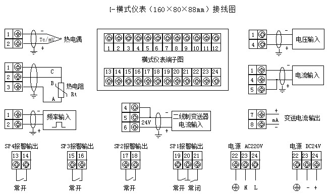 e)帶24V直流電源輸出的儀表,僅用于與二線制4-20mA輸出的無源變送器配套。該電源在儀表內(nèi)部與輸入采樣電路連接,不可作為其它電源使用。