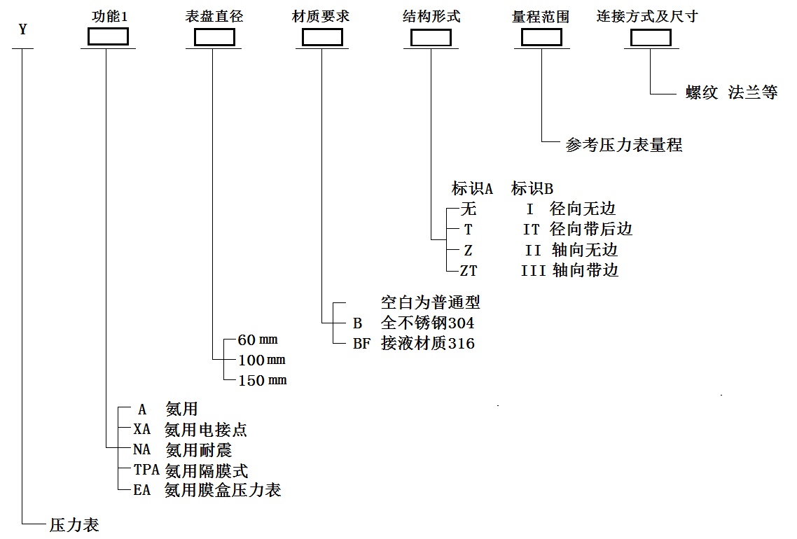 2、本公司還提供YNA系列耐震氨壓力表,YXCA氨用電接點壓力表.YE氨用膜盒壓力表,YTP氨用隔膜壓力表等產(chǎn)品。